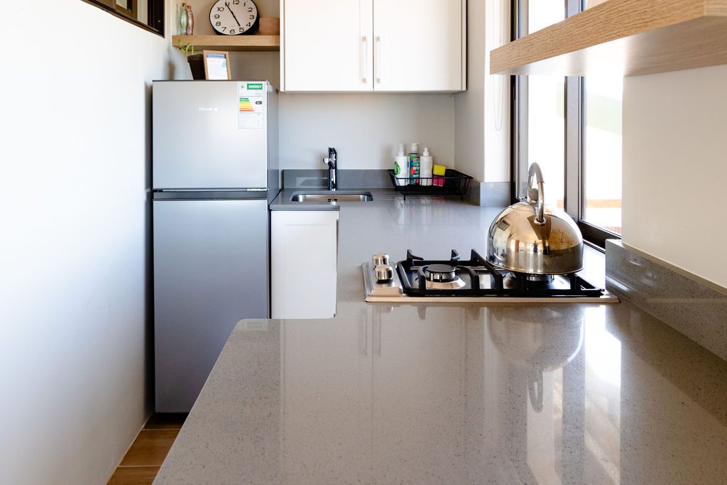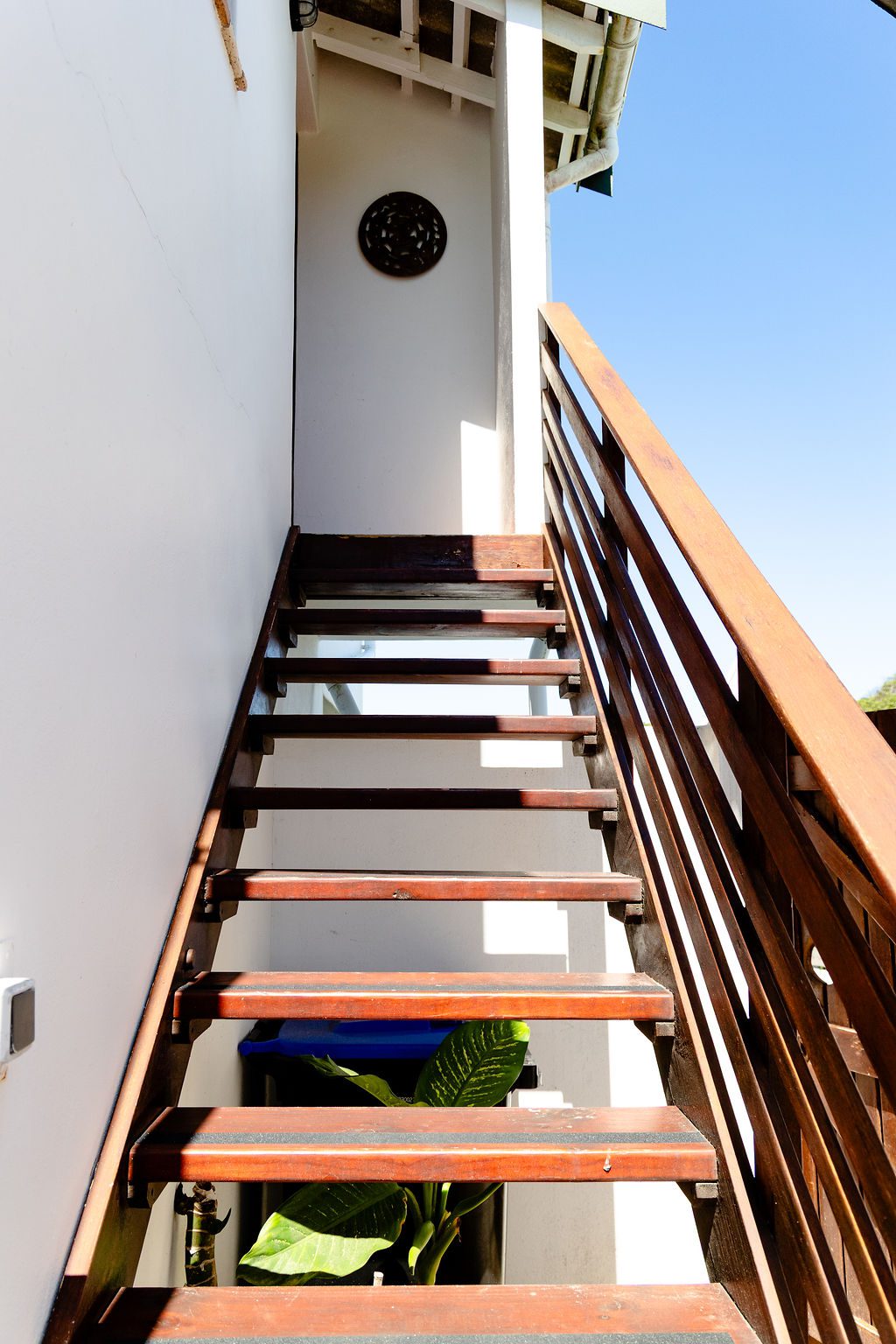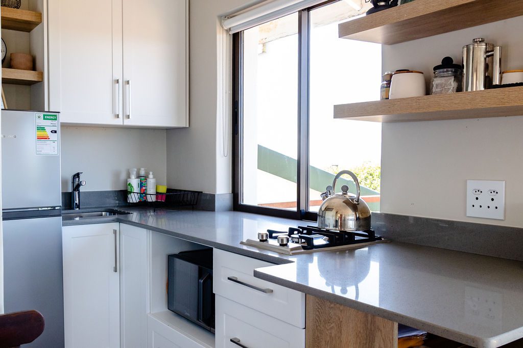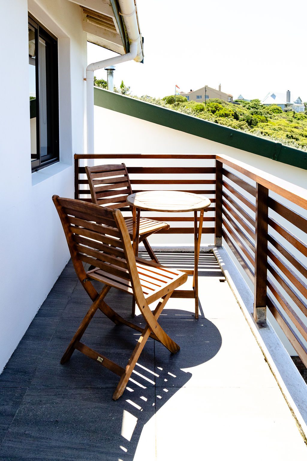 Flatlet/Studio above garage is equipped with a kitchenette/bedroom with sliding doors opening out onto a wooden deck balcony with sea views.