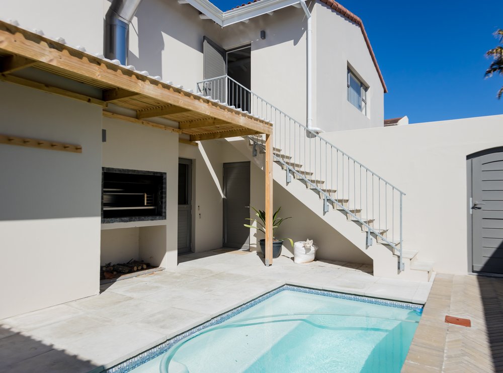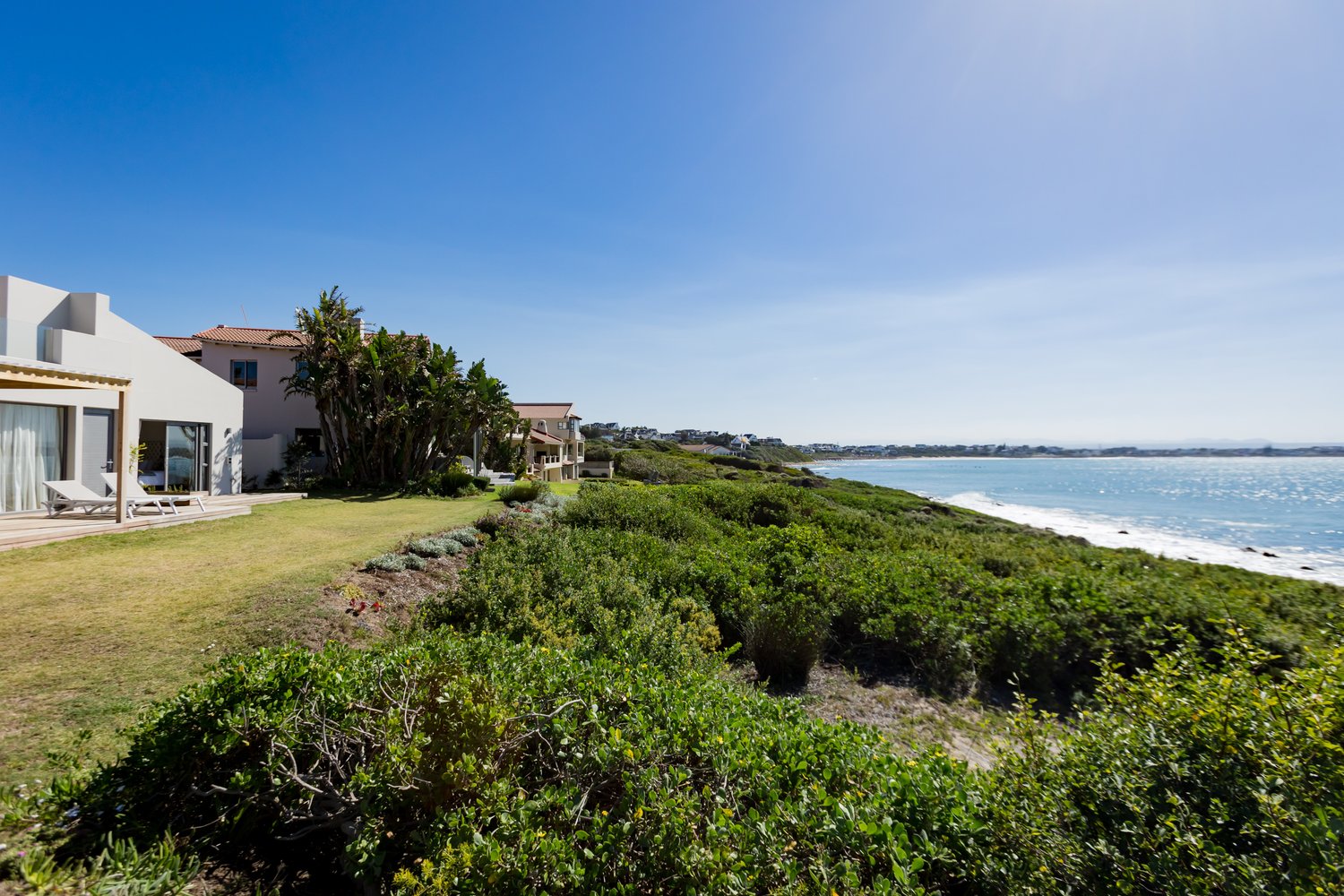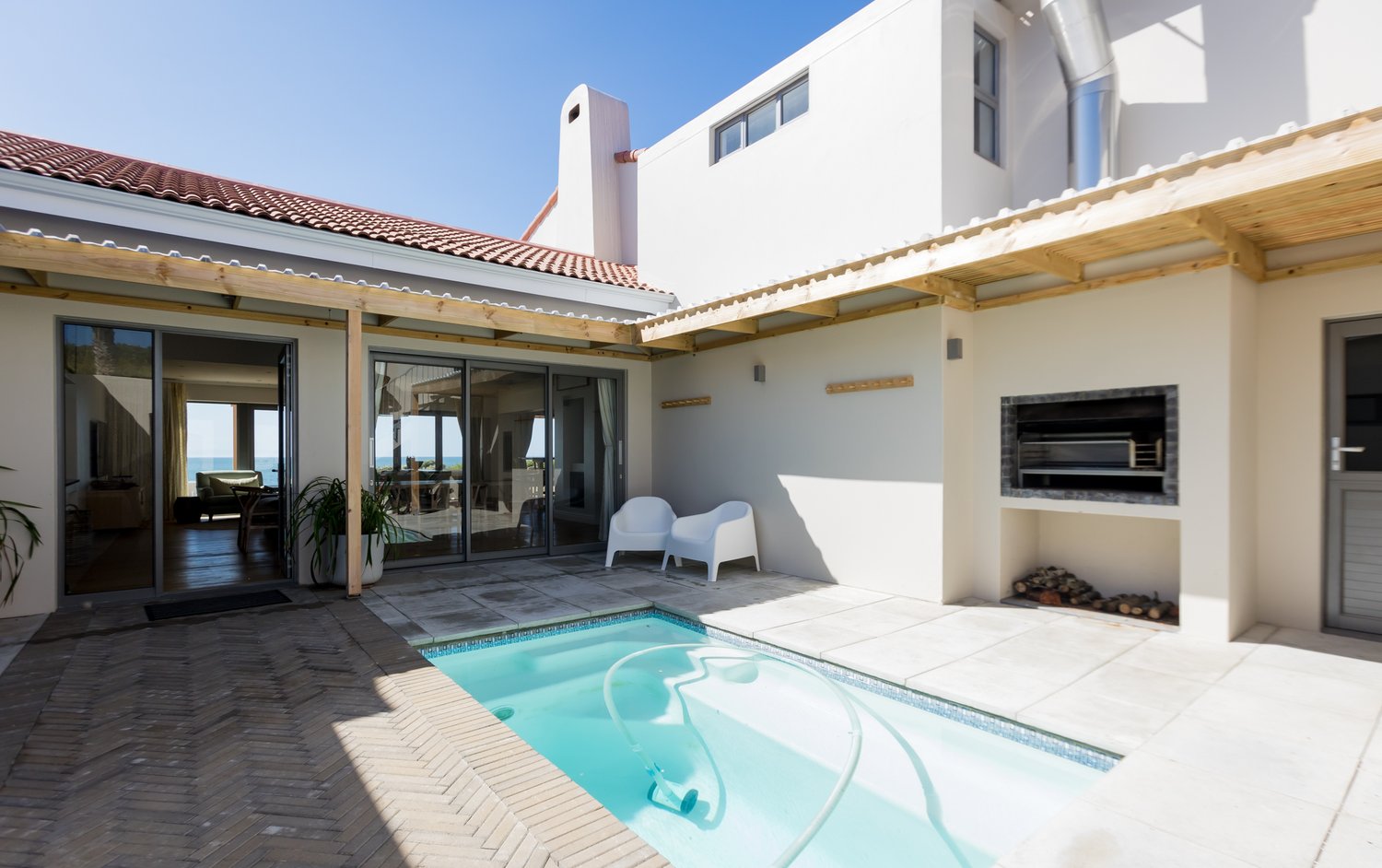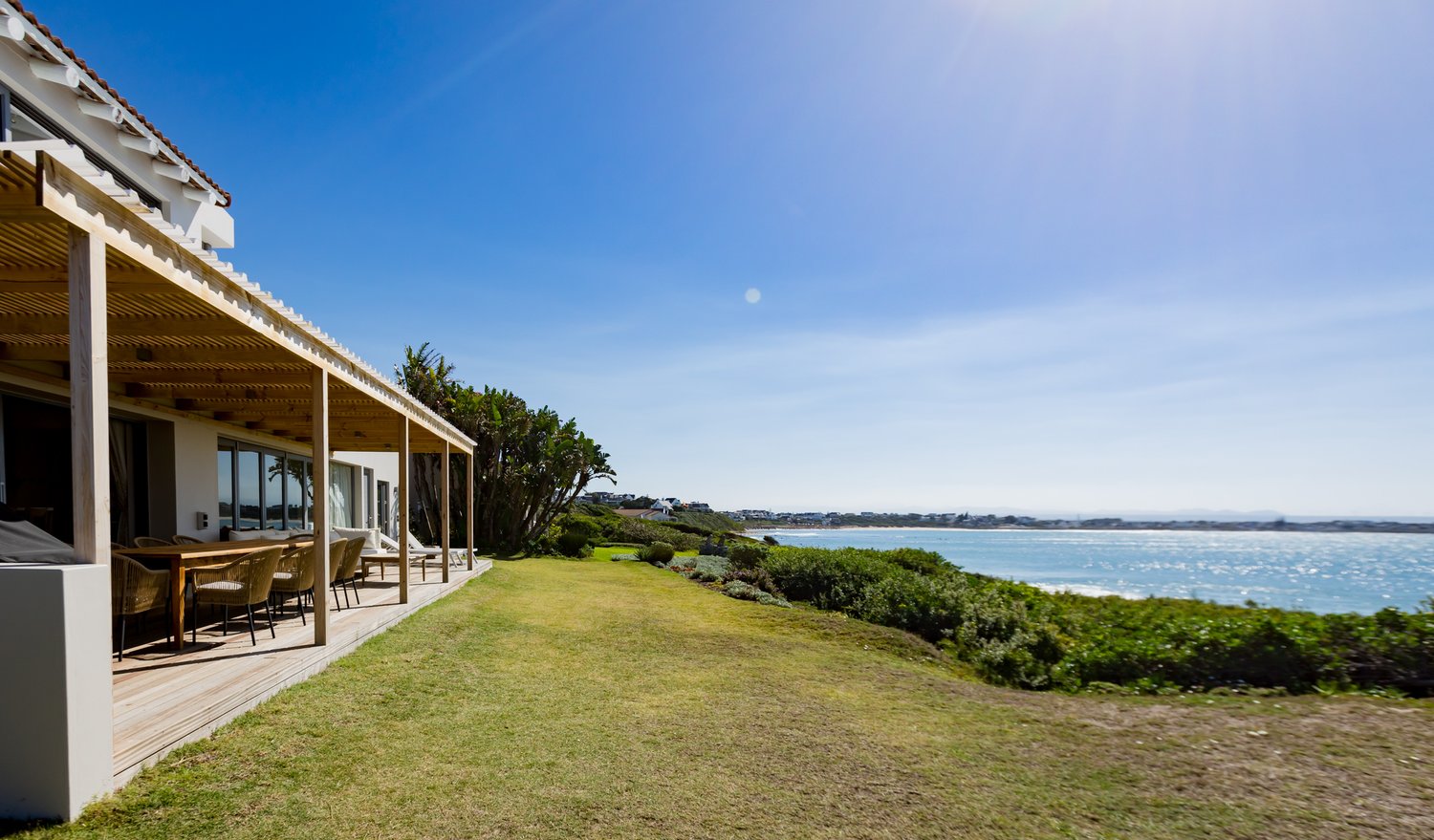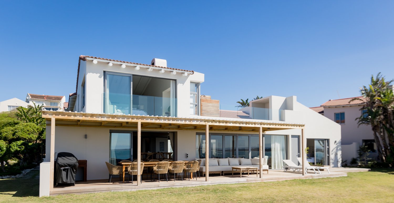 Gorgeous bespoke seafront Santareme home overlooking the bay with a large open plan kitchen, dining and lounge area opening out onto the deck, pool area and sea. Protected courtyard for braaing.