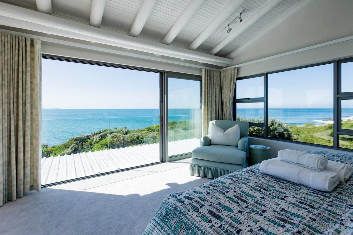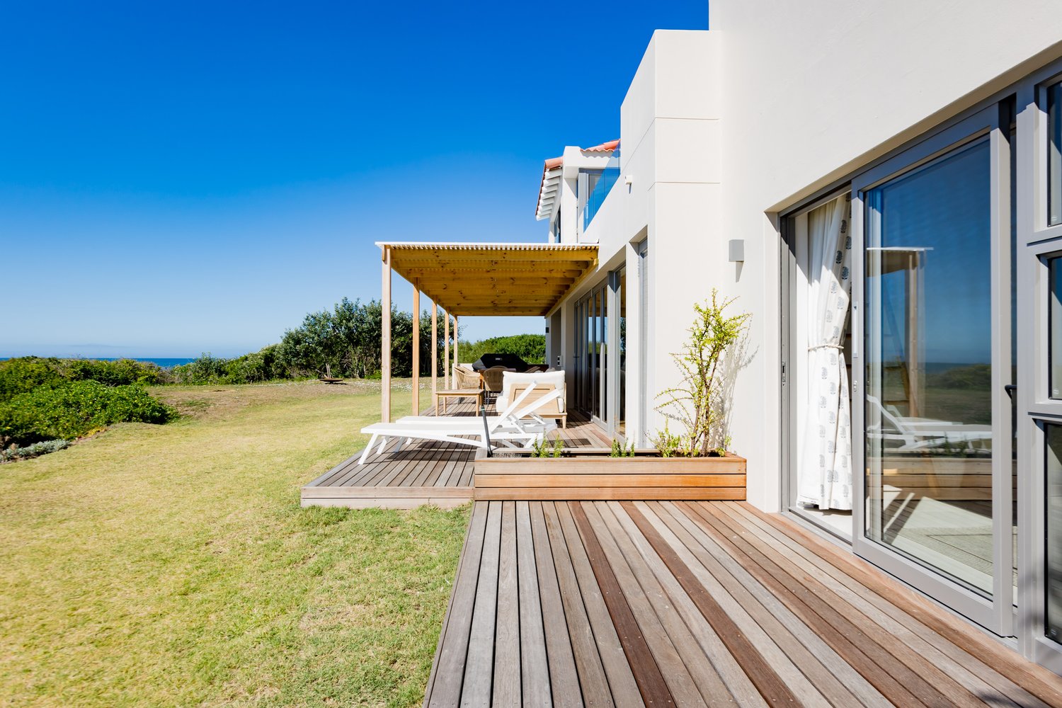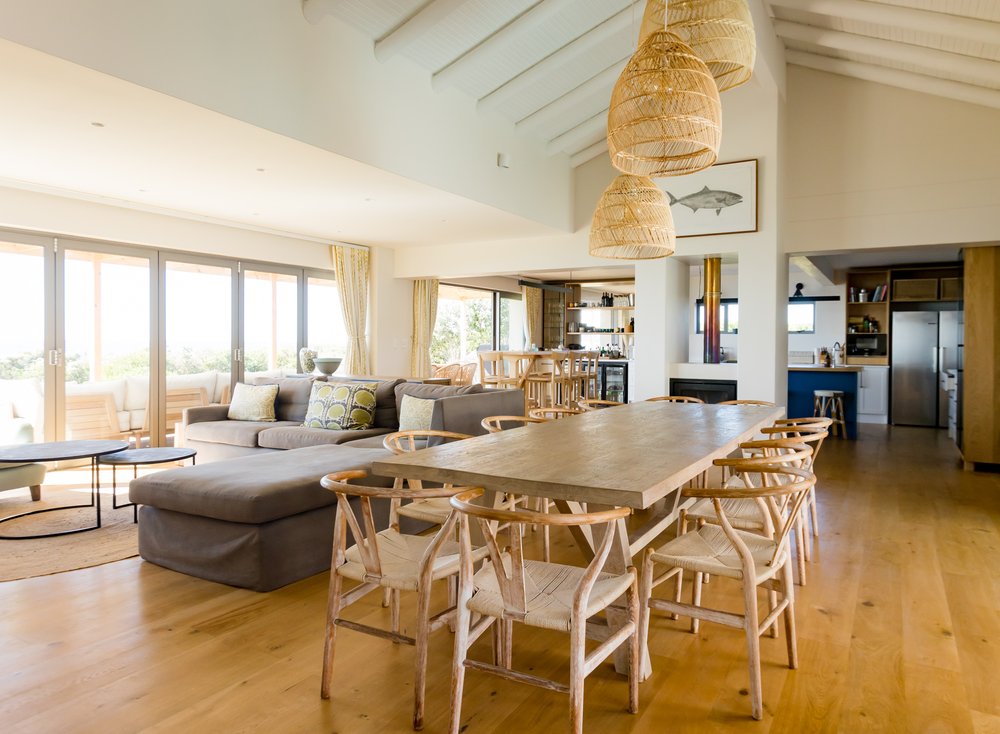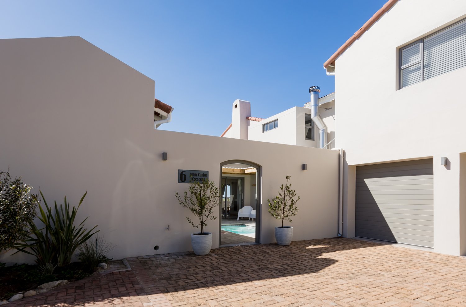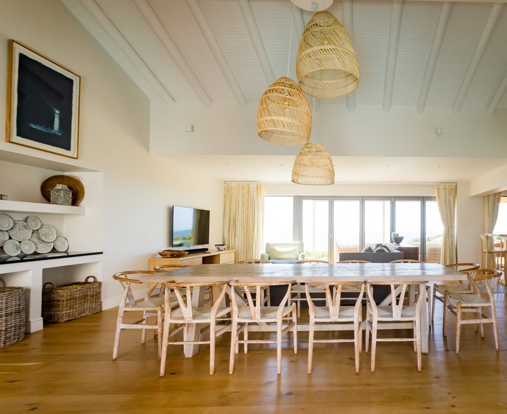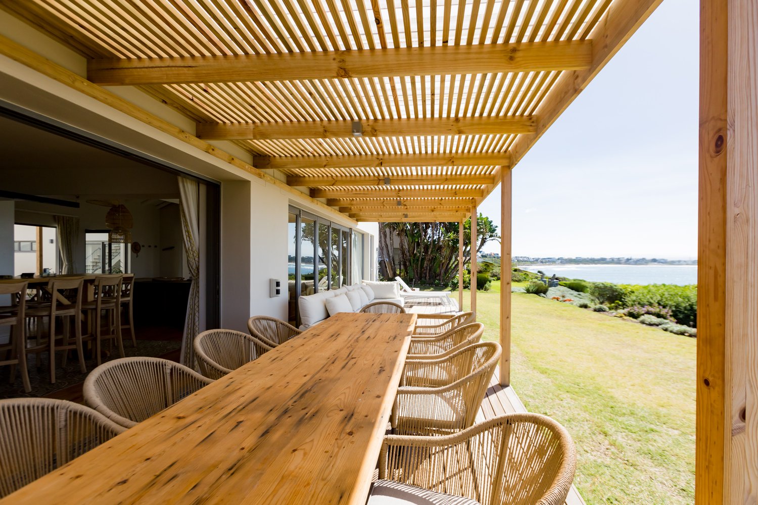 Gorgeous bespoke seafront Santareme home overlooking the bay with a large open plan kitchen, dining and lounge area opening out onto the deck, pool area and sea. Protected courtyard for braaing.