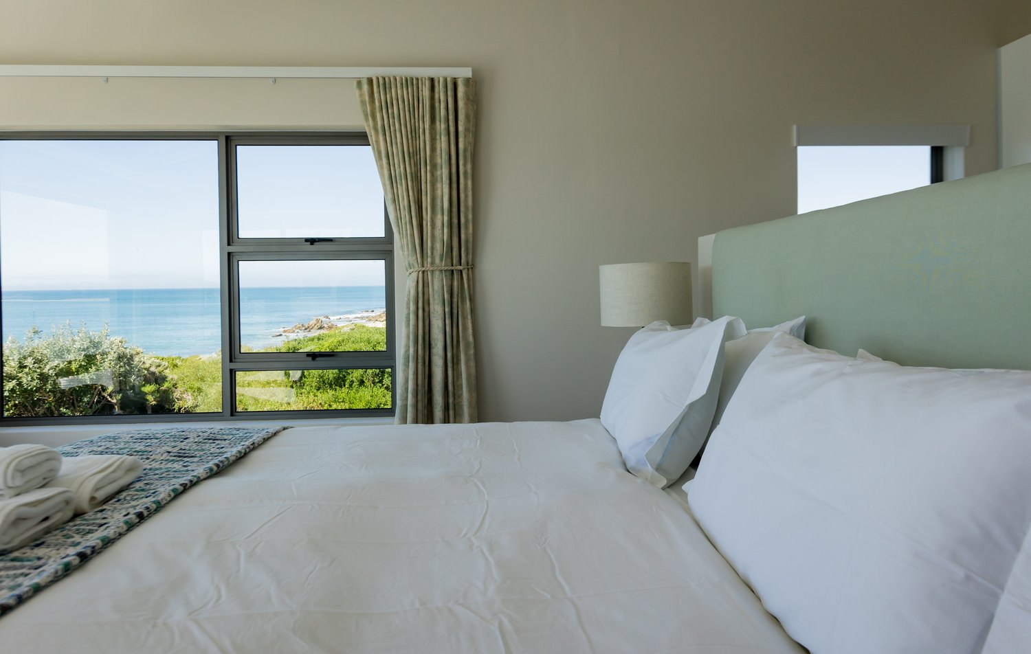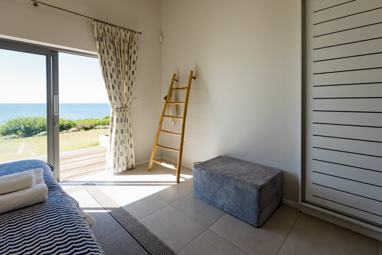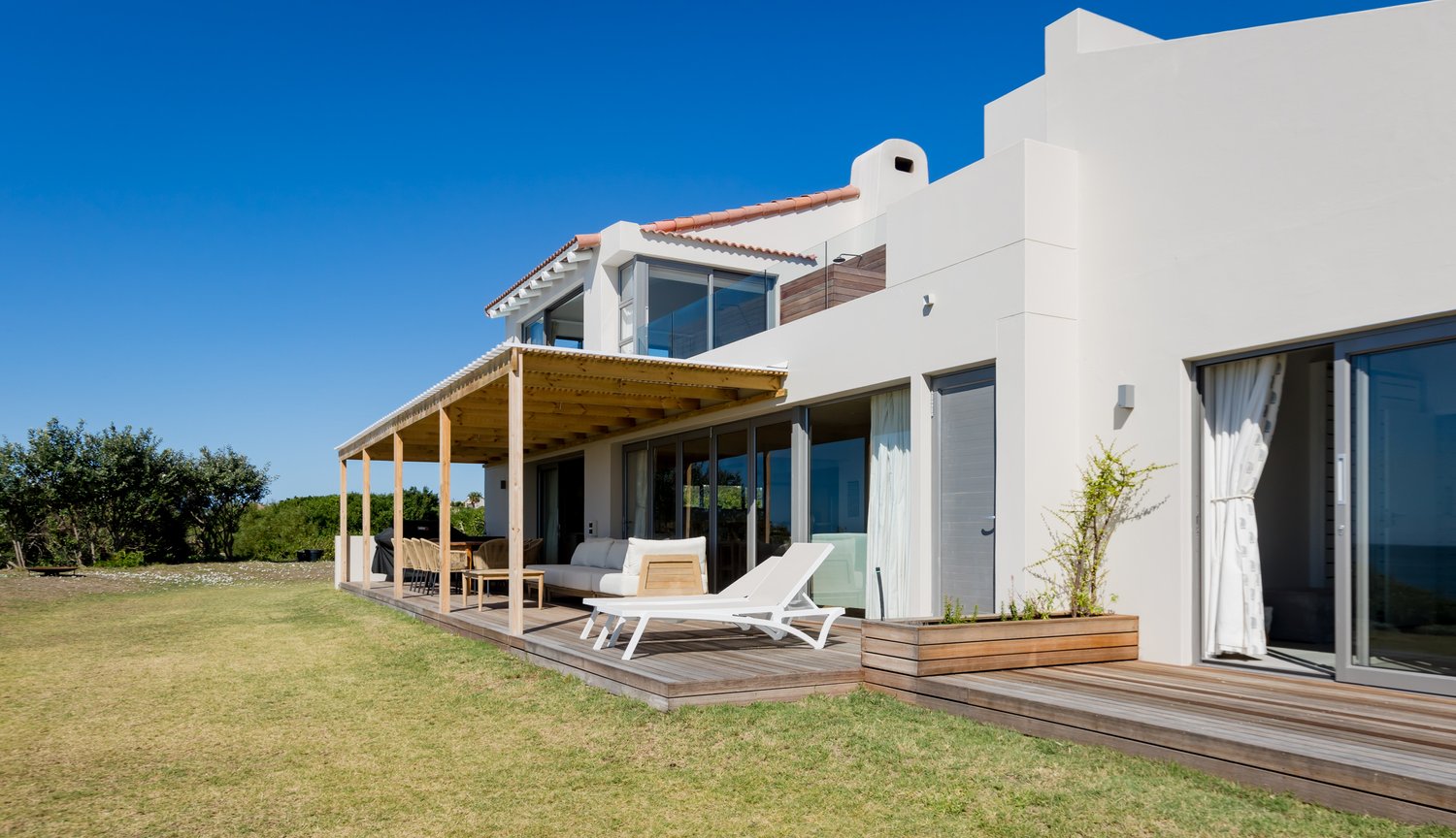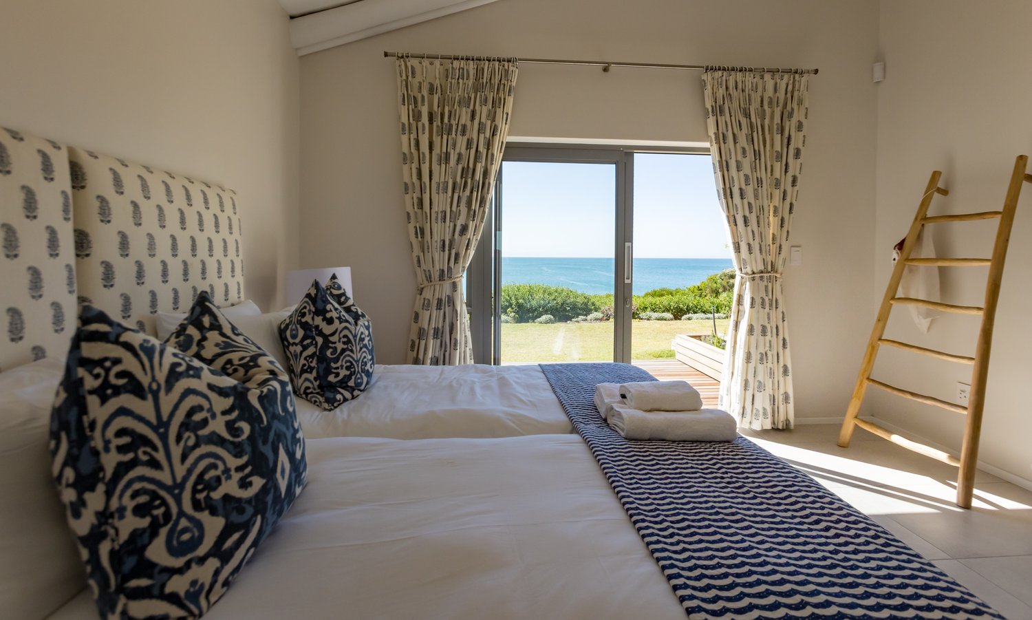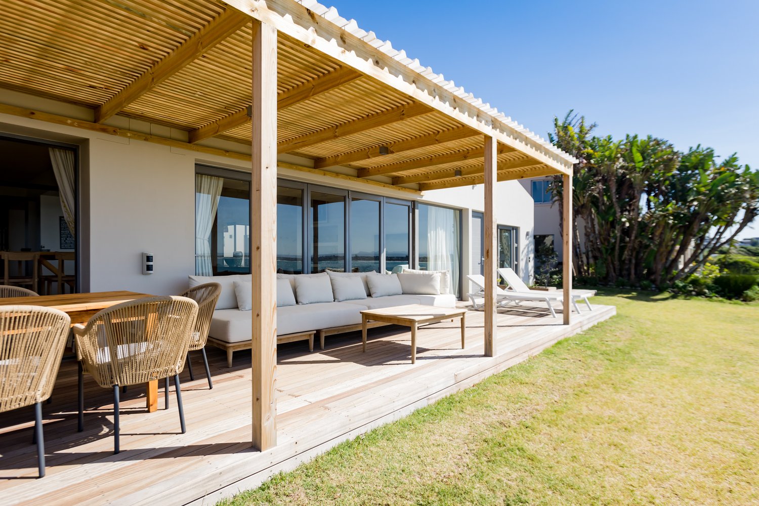 Gorgeous bespoke seafront Santareme home overlooking the bay with a large open plan kitchen, dining and lounge area opening out onto the deck, pool area and sea. Protected courtyard for braaing.