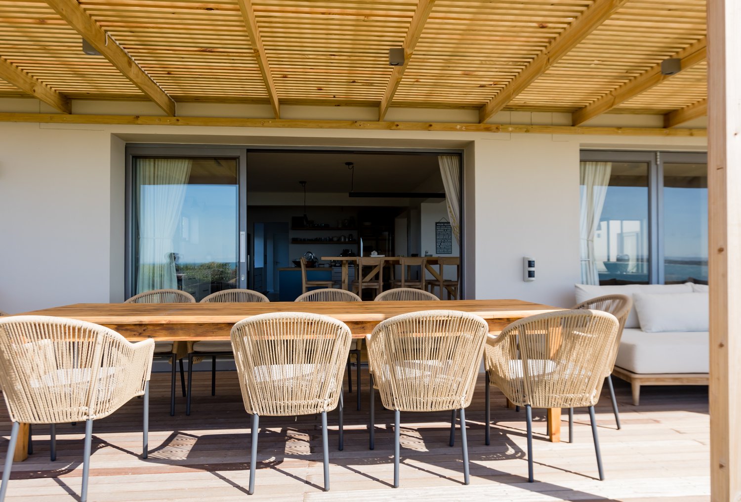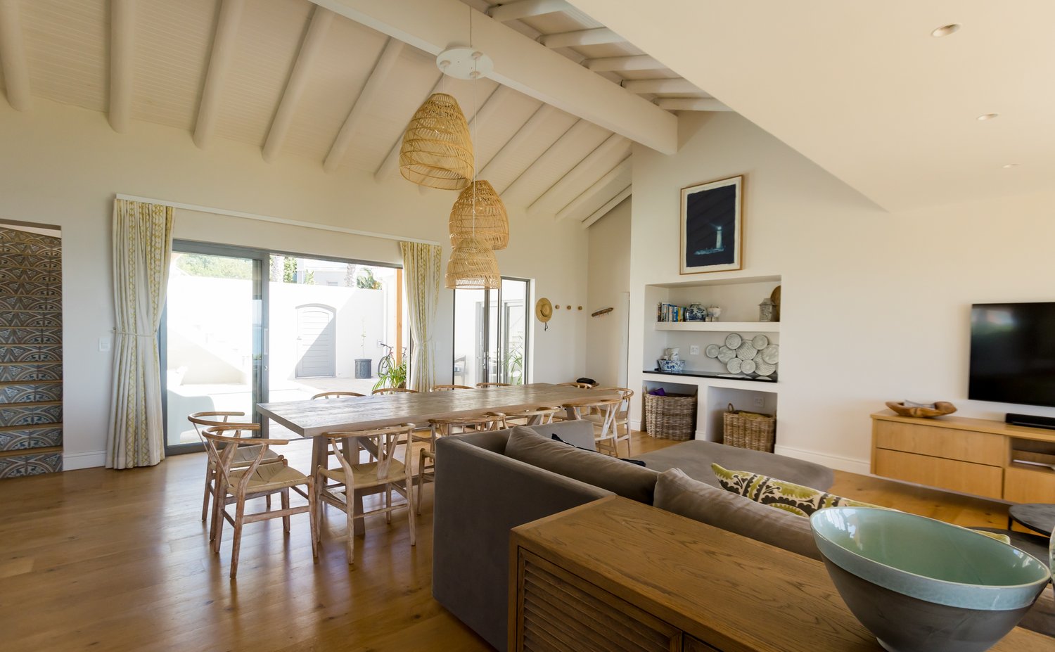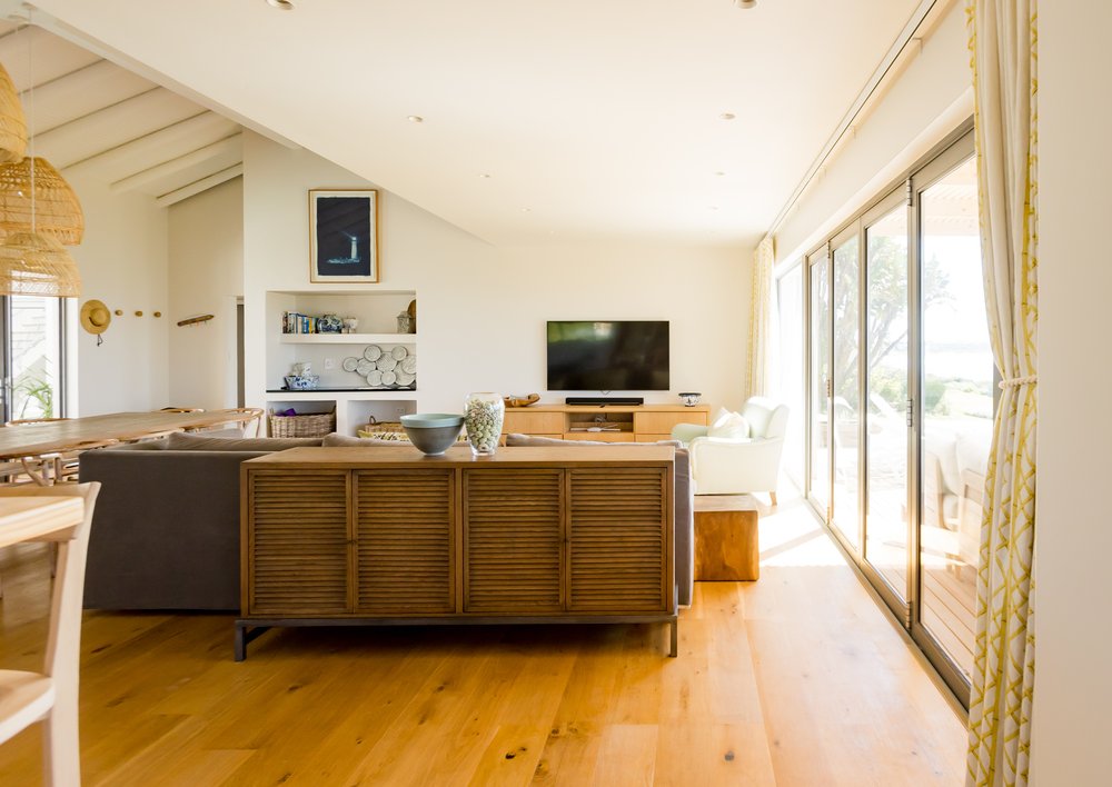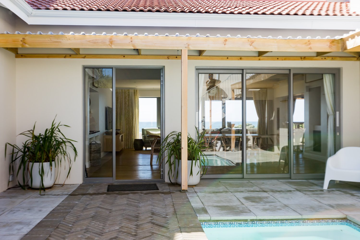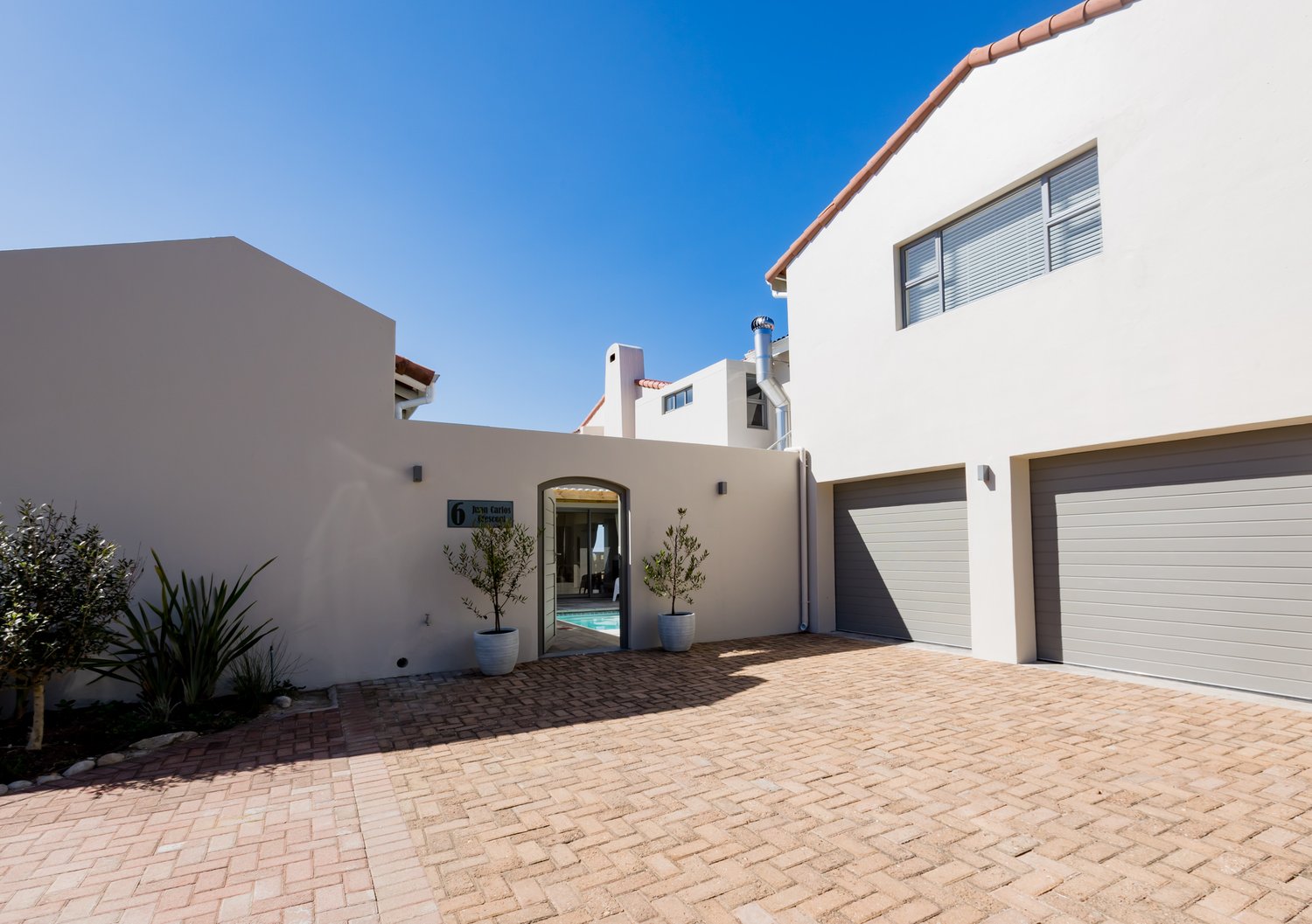 Gorgeous bespoke seafront Santareme home overlooking the bay with a large open plan kitchen, dining and lounge area opening out onto the deck, pool area and sea. Protected courtyard for braaing.